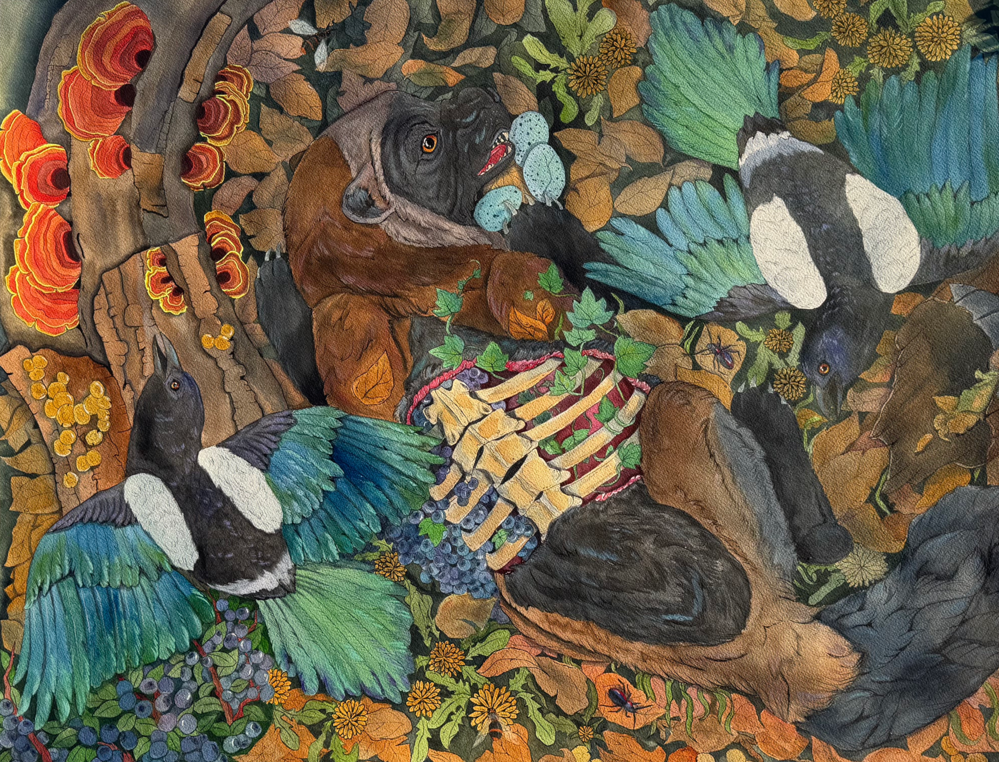 A field mouse climbing and snacking on raspberries.